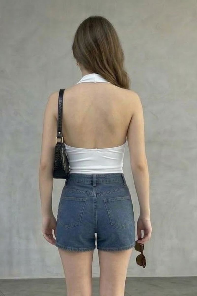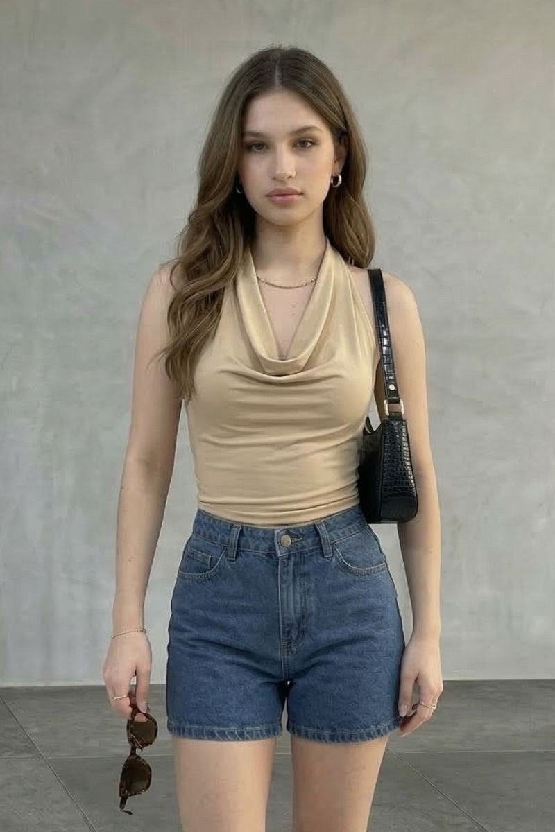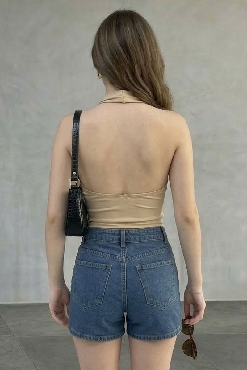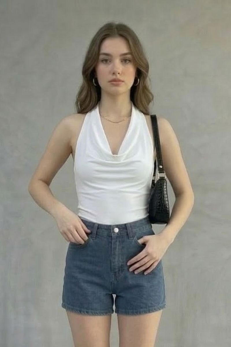 Polo Sarahi en tela suplex con cuello halter y elástico en la espalda, diseñado para un ajuste cómodo que realza la silueta.Un top moderno y versátil, ideal para crear outfits frescos y estilosos en cualquier ocasión.