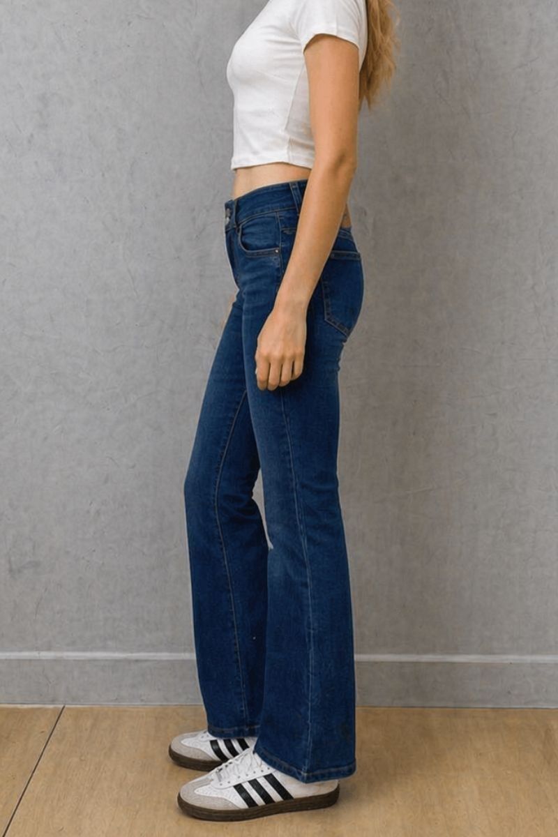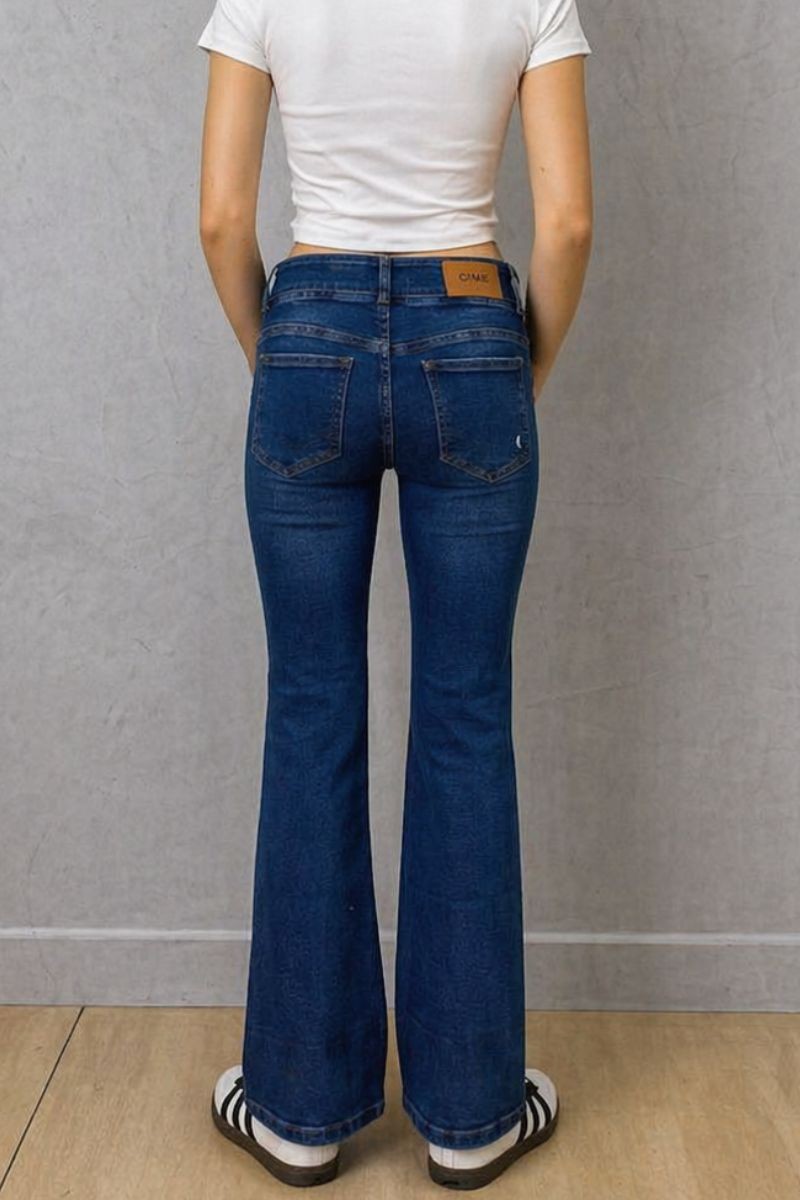 Es de denim stretch que se adapta al cuerpo y realza la silueta. En azul focalizado para un look moderno, cuenta con tiro semi cadera y detalle de doble botón que estiliza la cintura. Su bota flare alarga visualmente las piernas, perfecto para outfits casuales y urbanos.