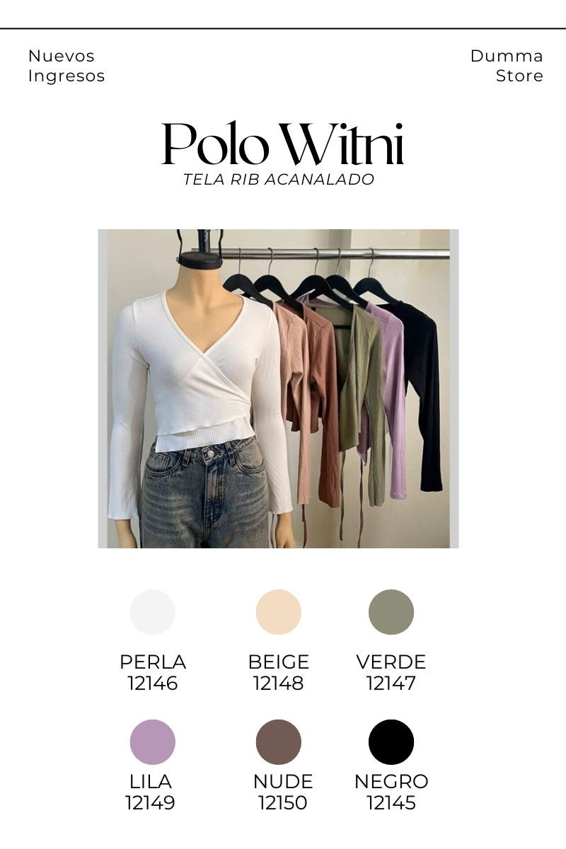 Nuestro polo Witni es una prenda imprescindible para elevar tu estilo con un toque moderno y femenino. Confeccionado en tela rib acanalado, este polo de manga larga se adapta perfectamente al cuerpo, brindando comodidad y un fit favorecedor. Su diseño abierto cruzado con amarre en el lado izquierdo resalta la silueta de forma sutil, mientras que las mangas acampanadas aportan un aire elegante y en tendencia. Ideal para crear outfits versátiles, el polo Witni es perfecto para looks casuales o más sofisticados, combinándolo con jeans, faldas o pantalones de tiro alto.