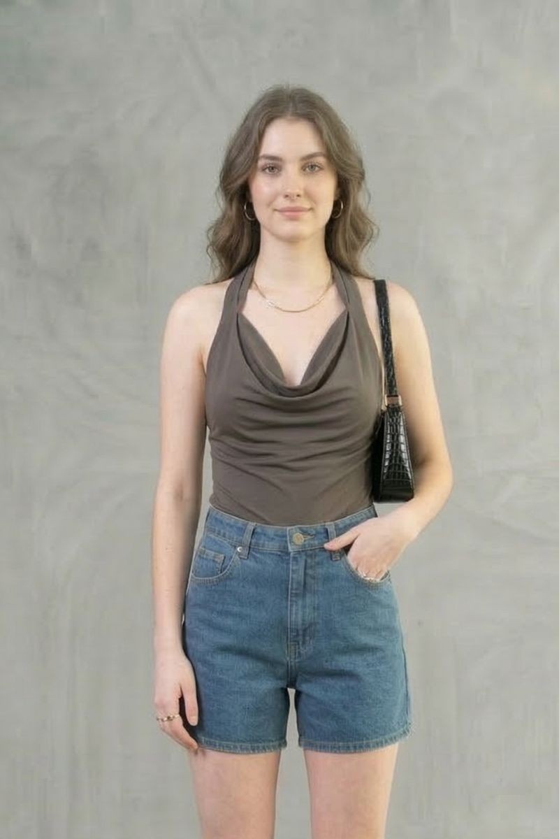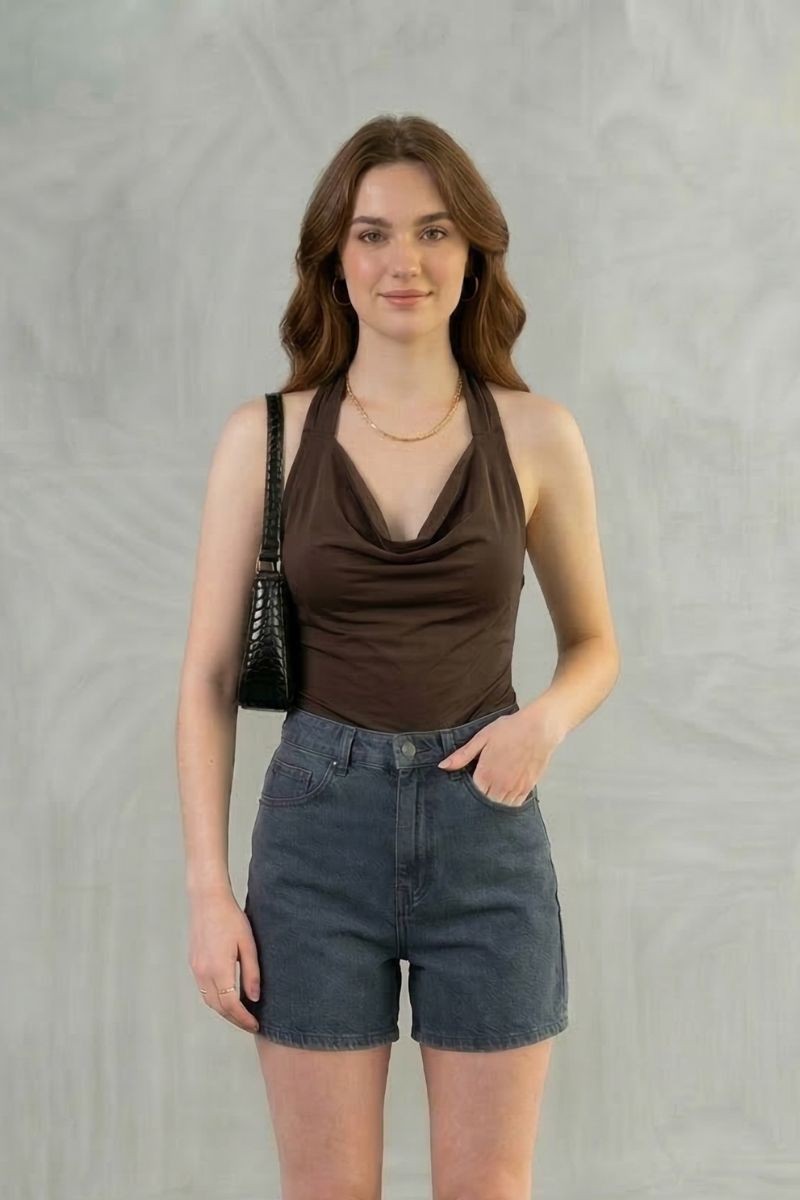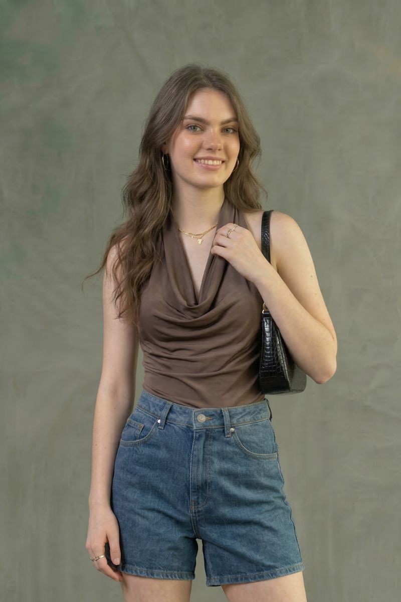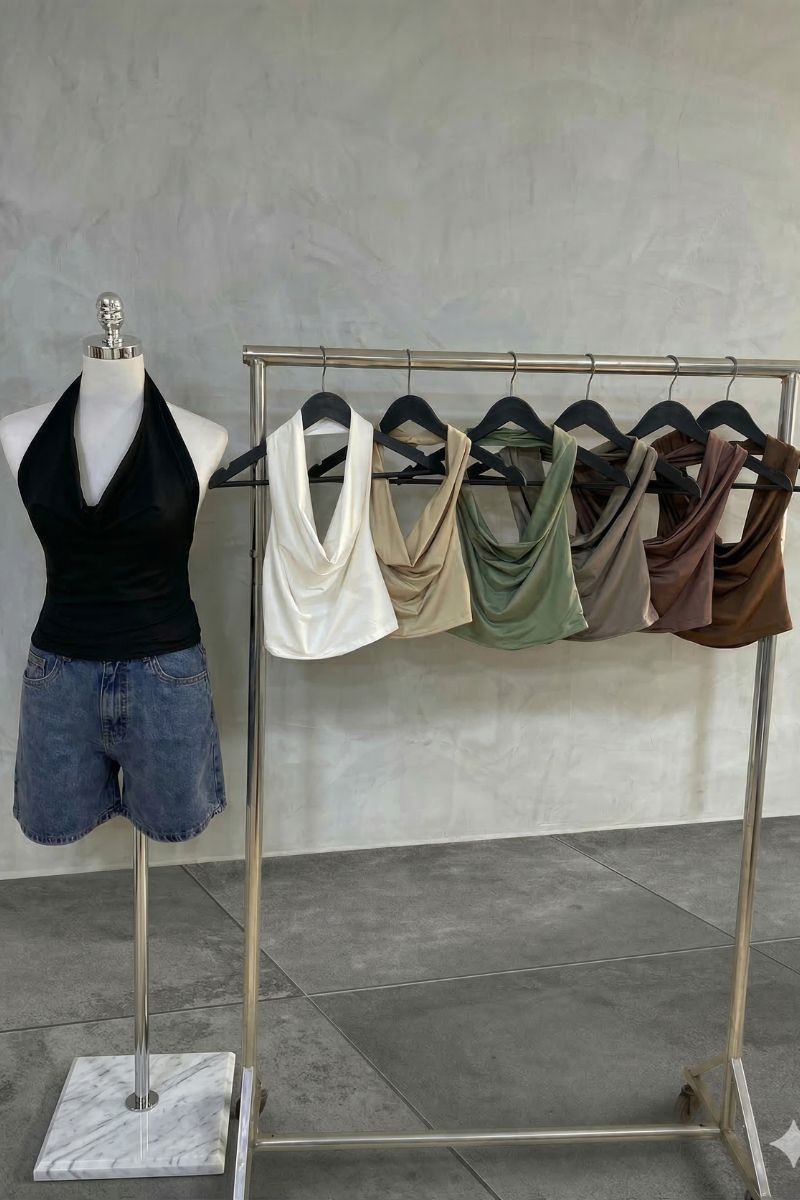 Polo Sarahi en tela suplex con cuello halter y elástico en la espalda, diseñado para un ajuste cómodo que realza la silueta.Un top moderno y versátil, ideal para crear outfits frescos y estilosos en cualquier ocasión.