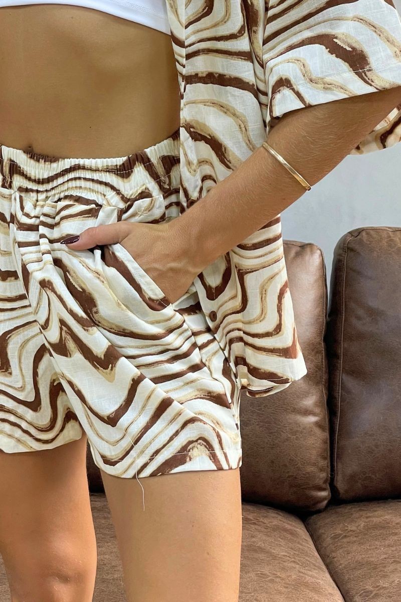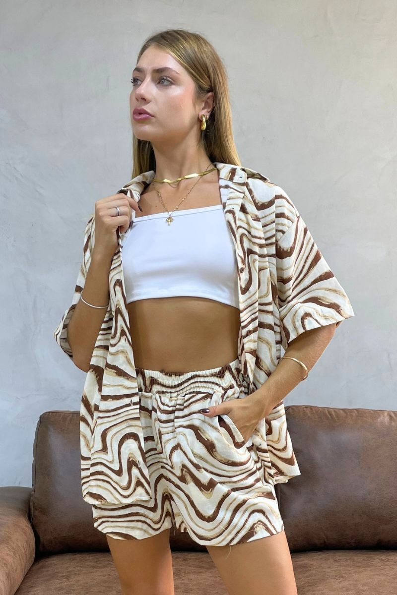 Fresco, moderno y lleno de estilo. Confeccionado en tela lino con diseño marmoleado, es perfecto para destacar con un look relajado pero sofisticado. La blusa de manga corta y fit suelto brinda una caída ligera y cómoda, mientras el short con elástico en la cintura se adapta al cuerpo y suma funcionalidad con bolsillos laterales. Ideal para outfits effortless con personalidad.