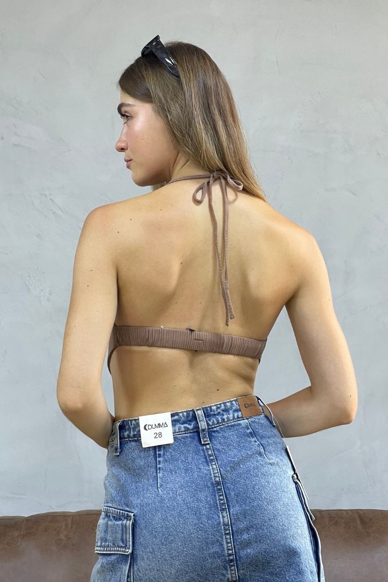 Ligero, coqueto y con un toque único. Confeccionado en rib acanalado, se adapta suavemente al cuerpo. Cuenta con detalle para amarrar al cuello, basta en punta que estiliza la silueta y espalda con elástico para un mejor ajuste. Ideal para looks femeninos y versátiles.